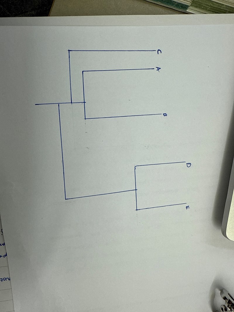 - Gruppen som innehåller A, B och C är systergrupp med den grupp som innehåller D och E.