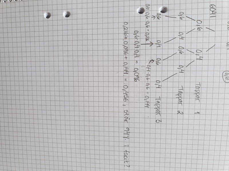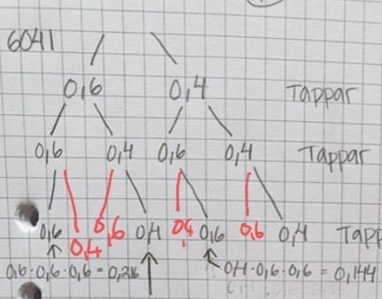 Från varje utfall ska det gå två linjer ner nästa möjliga utfall. Du har missat flera möjliga utfall av tredje tappet.