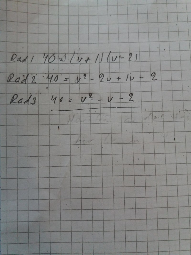 Jag tycker alltså att det ska stå 40=(v-2)(t+1) 40=(v-2)(t+1) på din första rad (Rad 1 på din bild).
