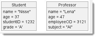Sedan ska jag skapa två instanser av varje klass och det är här jag fastnar för jag förstår inte hur jag ska göra det? Kommer generaliseringen finnas kvar? Hamnar alla attributer som sub klasserna ärver från huvudklassen i instanserna? Behöver verkligen hjälp att förstå om det är någon god själ här som är duktig på sånt här:)