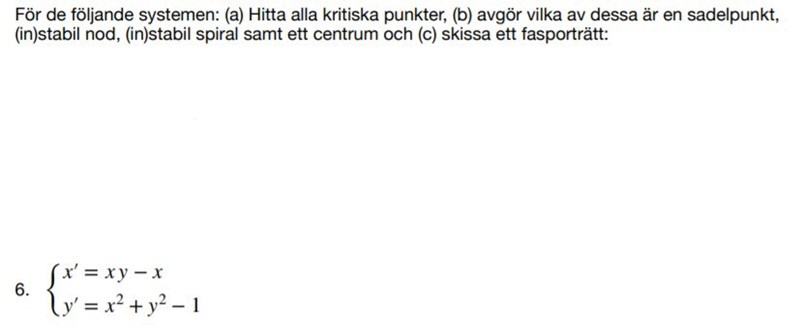 Hej! Jag har en till fråga. På denna tänkte jag att jag tar fram de kritiska punkterna med det(A-lambda*I)=0, undersöker dem med jakobinen. Dock är denna uppgift lite annorlunda från den förra och jag undrar om det är fasplansmetoden som skall användas? Jag testade den men jag kom inte längre än till att jag ställde upp dy/dx = (xy-x)/(x^2+y^2-1) då den inte är separabel. Vilken metod ska man egentligen använda?