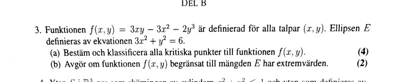 (b) Ellipsen är en sluten och begränsad delmängd av R2 och således kompakt. Funktionen f är kontinuerlig. Således antas max och min på ellipsen. Det står inte att man behöver räkna ut dessa, men gör ett försök i alla fall.
