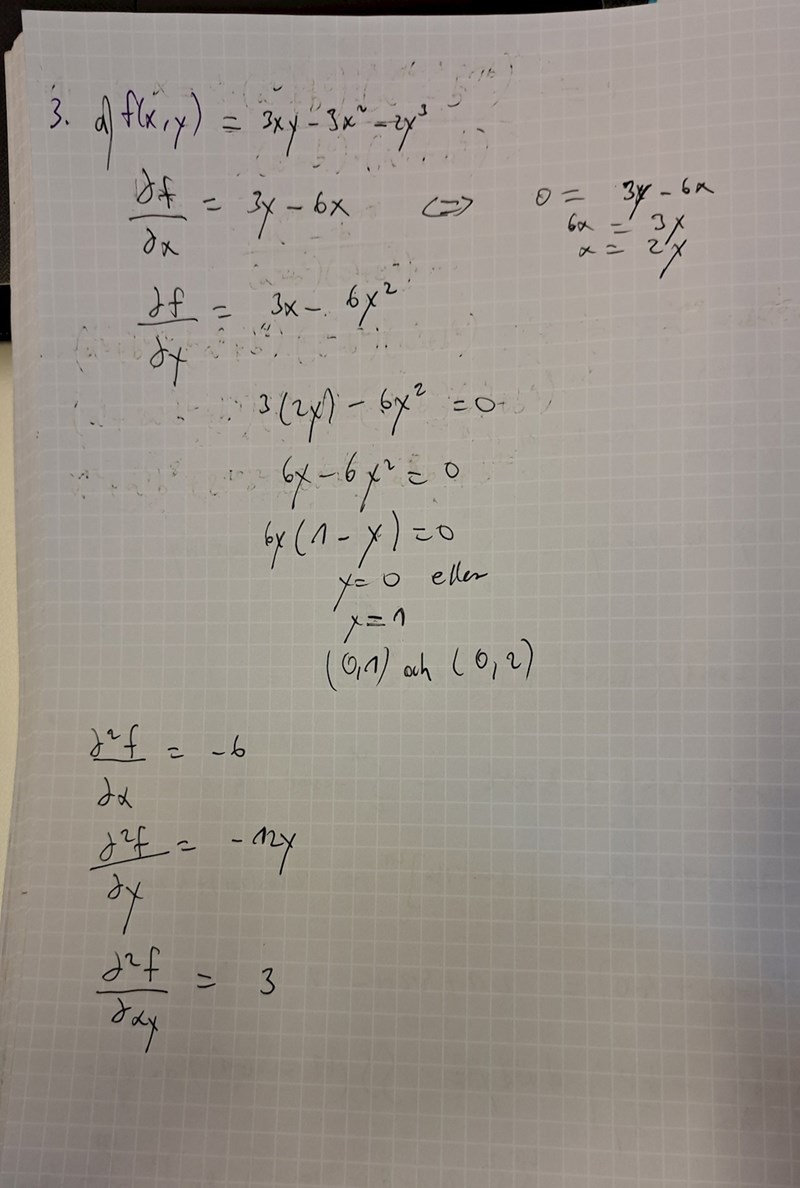 Ja jag har glömt lite av den här kursen det är därför jag skrev typ så. Ja precis (0,0) och (0,1/8). Sen tar man hessianmatrixen. Tack för hjälpen!