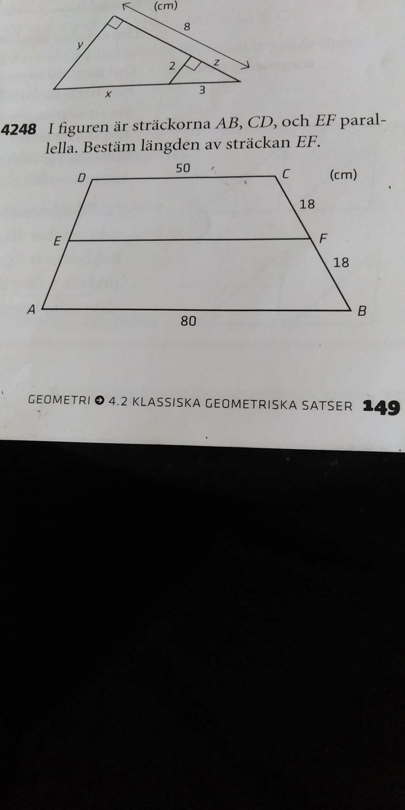 men jag kommer ingen vart, vi har lärt hos bisektrissatsen, transversalsatsen och topptriangelsatsen, samt likformighet hittills. Jag tänkte att jag kunde utföra transversalsatsen eftersom att dem var parallela men det blir svårt.