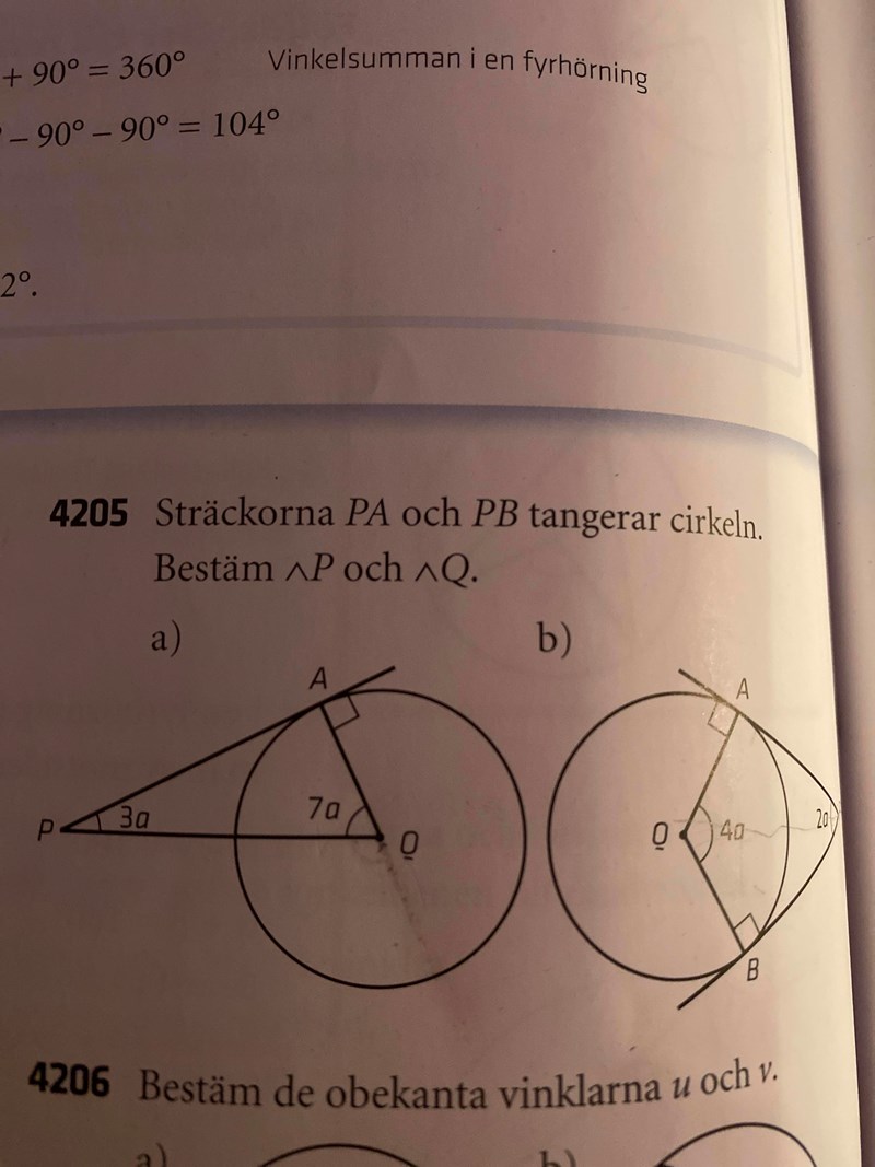 Det här är uppgiften: Sträckorna PA och PB tangerar cirkeln. Bestämt vinkeln P och Q.