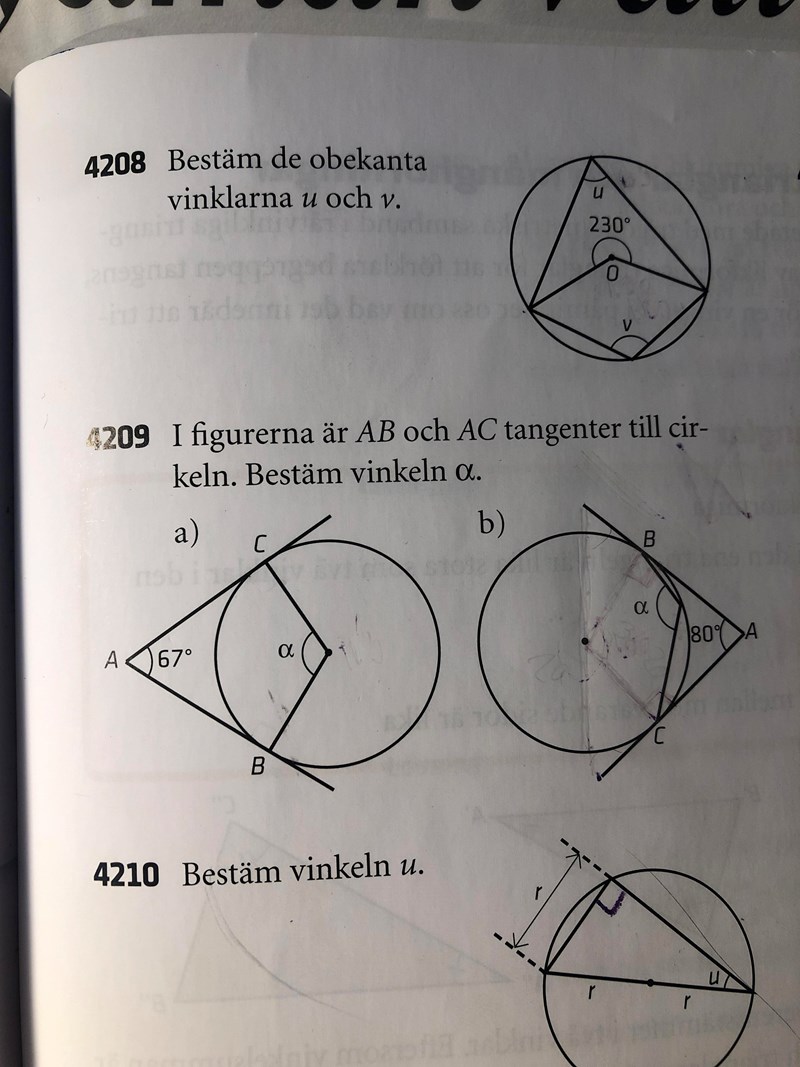 Hej! Jag skulle behöva hjälp med 4209 b)! Jag har försökt dra två radier från mittpunkten till tangenterna, vilket visar att det bildas två 90 graders vinklar men jag får fel svar!
