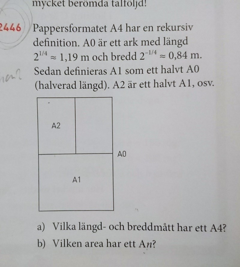 a) Delar vi en A0 i 2, får vi en A1. Delar vi den i 2 får vi en A2. Delar vi A2:an i 2 får vi en A3, och det behövs dela saken i 2 igen för att få en A4.