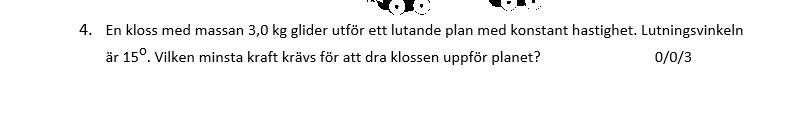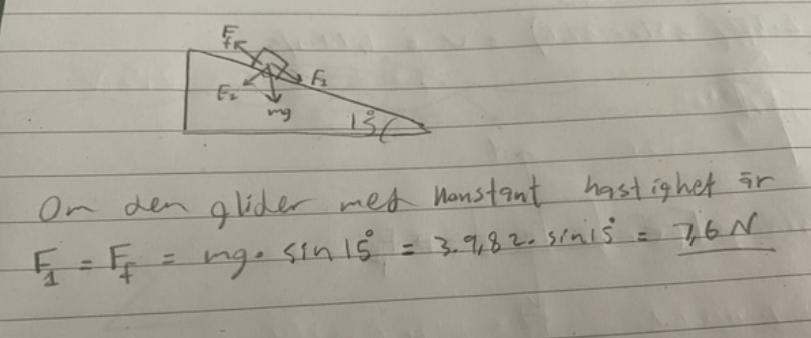 När den glider med konstant hastighet är friktionskraften = tyngdkraftens komposant som är parallell med planet, dvs mg*sin(15)