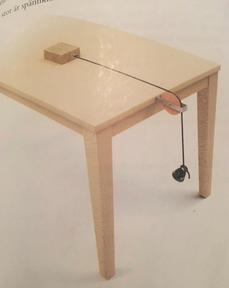 Snöret är inte töjbart, så om vikten ramlar neråt följer klossen på bordet med. Det verkar som om du borde göra ett litet experiment hemma. Det behöver inte vara en kloss och en vikt.