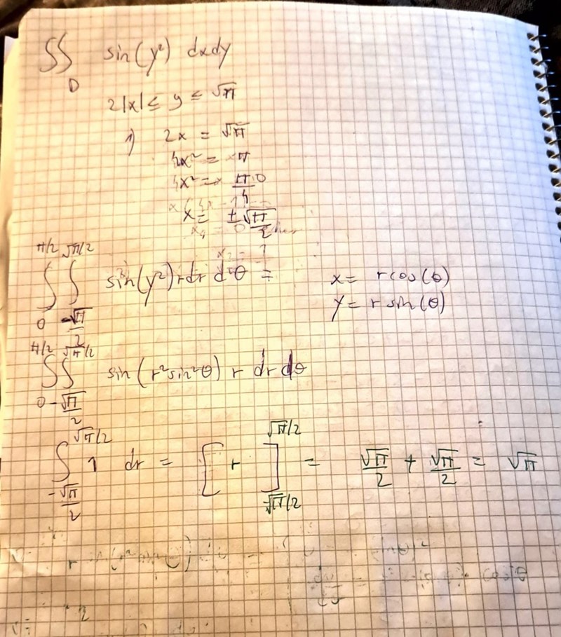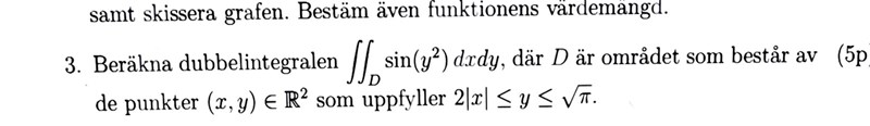 jag är fast på hur jag ska integrera sin(y^2). jag omvandlade y till polära koordinater till att börja med. Räknade även ut integralen med avseende på r