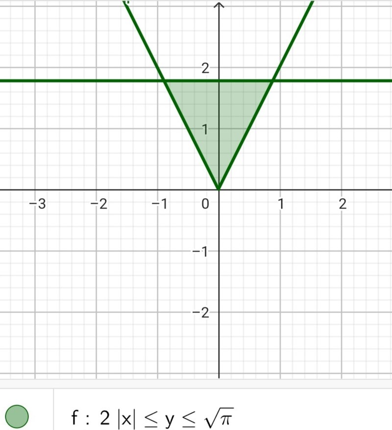 Jag förstår ej hur jag ska integrera över x. Jag satte y=2|x| då fick jag y/2 =x1 samt -y/2=x2. Gällande sqrt(pi)=y vet jag ej vad undre gränsen är ?