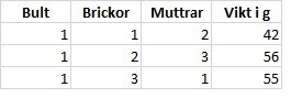Tittar vi på tabellen så ser vi att en bricka plus en mutter ökar vikten från 42 till 56 g, alltså med 14g