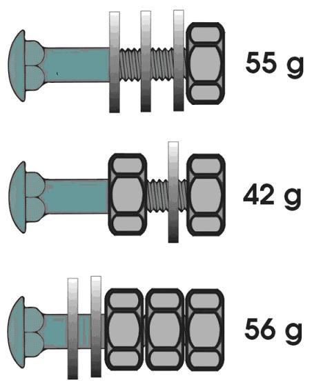 Eftersom vi vet hur mycket varje bricka väger, kan vi plocka av dem genom att subtrahera deras vikt från det totala. Nu skulle vi vilja göra något liknande med muttrarna som vi gjorde ovan, alltså hitta ett sätt att få en identisk uppsättning sånär som på bultarna. Hur skulle du kunna göra då?