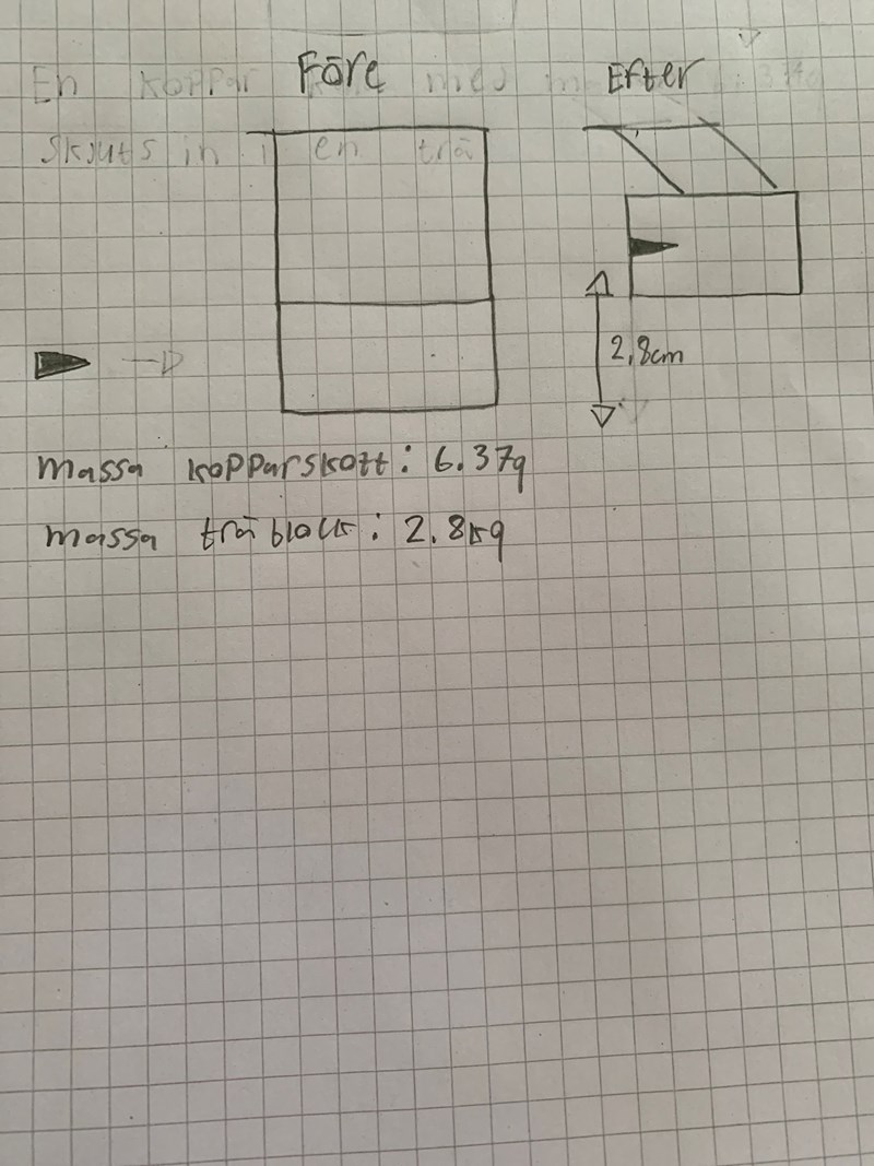 Ett Träblock hänger på två snören, sedan skjuts ett kopparskott på träklossen som stannar i träblocket och träblocket med skottet inuti gunga up 2.8cm