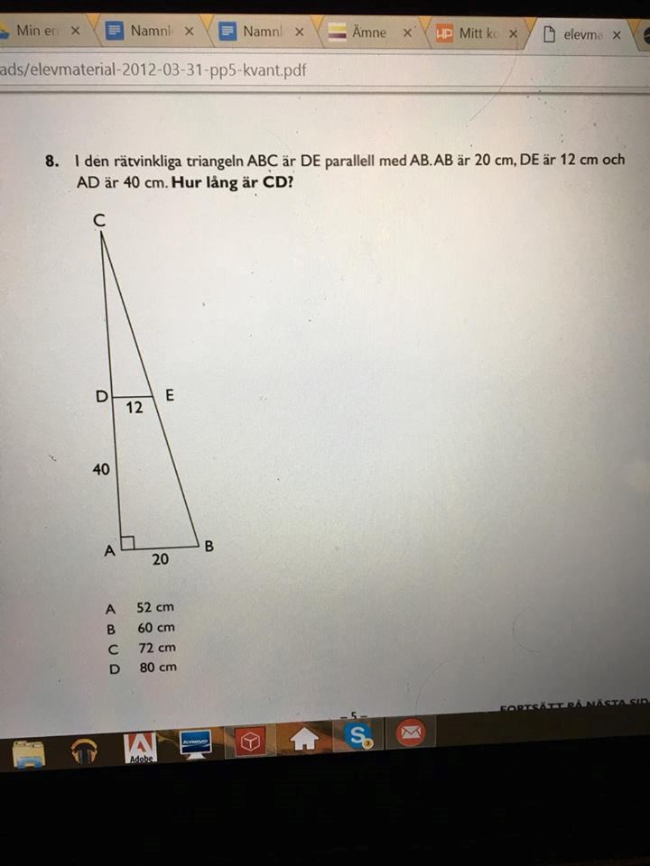 Sätt ut lite mått (du kan t.ex. kalla CD för x cm) och ställ upp en eller ett par ekvationer.