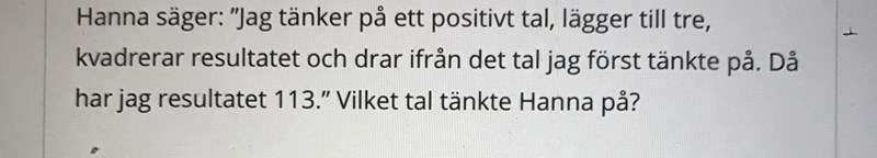 Då får du två lösningar, dels x = 8 och dels x = -13. Om du läser igenom uppgiften, kan du dra slutsatsen att -13 inte duger, fastän (-13)(-8) = 104. Varför?