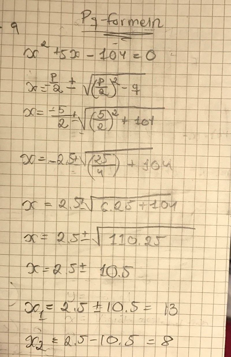 Jag fattar med pq formeln men det som gör mig förvirrad att när man räknar med pq formeln får man två svar. Jag får svaret 8 som man ska ha. Men vad gör jag med talet 13? Det förstår jag inte. Kan någon förklara vad det betyder. För nu har jag två noll ställen.
