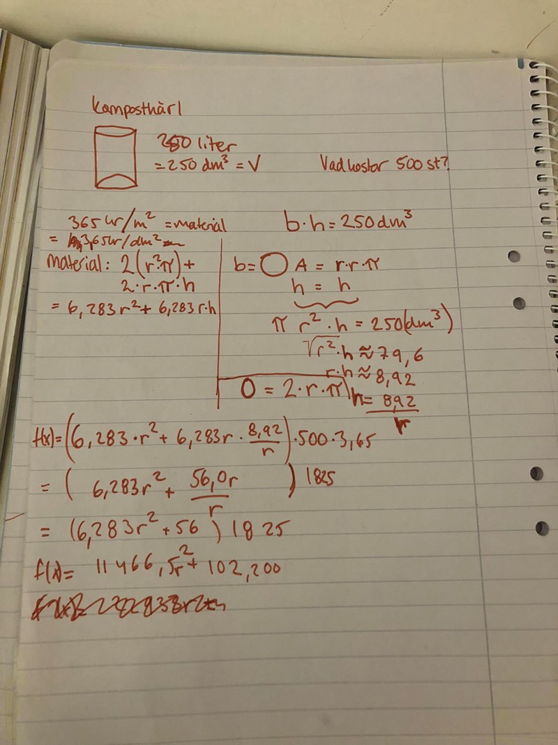 en fabrik ska tillverka kompostkärl. Dessa ska rymma 250liter och ha form av räta cirkulära cylindrar. Kärlen,som har lock, tillverkas i ett material som kostar 365kr/m2. Bestäm minsta möjliga materialkostnad då man tillverkar 500 kärl