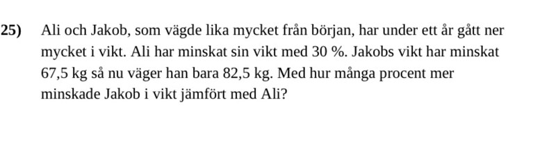 Låt säga att båda väger x kg. Ali kommer nu väga 0.7x och Jakob väger 82.5kg, hur mycket väger de ursprungligen? Vem väger nu mest/minst? För att sedan vet hur mycket mer någon väger, beräkna kvoten vikt1/vikt2.