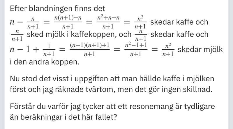 När man har hällt över en tesked mjölk till kaffekoppen finns det n skedar kaffe och 1 sked mjölk i kaffekoppen, totalt n+1 skedar, och n-1 skedar mjölk i den andra koppen. Är du med så långt?