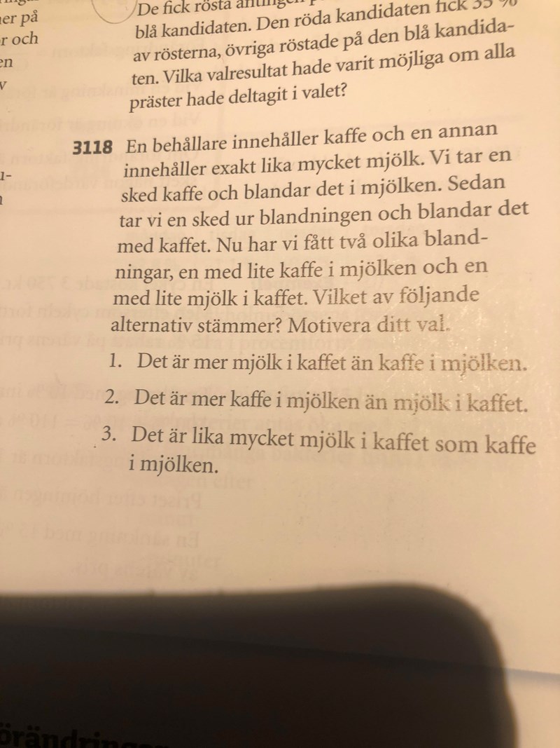 Nu stod det visst i uppgiften att man hällde kaffe i mjölken först och jag räknade tvärtom, men det gör ingen skillnad.