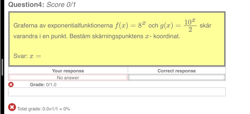 Försökte skriva de med samma bas, men lyckas inte. Misstänker att skärningspunktens x-koordinat är i intervallet 1<x<2. Vet dock inte exakta lösningen eller hur jag löser den algebraiskt. Hjälp mig gärna