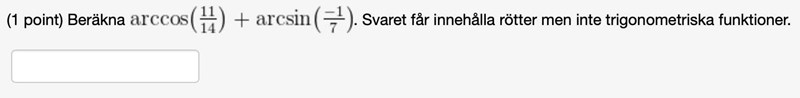 a=arccos(1114), b=arcsin(-17)a+b=y   ta cos av båda sidornacos(a+b)=cos(y)cos(a+b)=cos(a)cos(b)-sin(a)sin(b)=1114*437-5314*-17=4939849398=cos(y)y=arccos(49398)