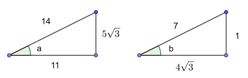 arccos(11/14) ger a triangeln och arcsin(-1/7) ger b triangeln mha av pytagoras.