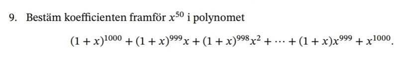Jag förmodar att binomialsatsen ska utnyttjas på något sätt. Utvecklingen liknar ((1+x)+x)¹⁰⁰⁰ men det stämmer ju inte riktigt... Några tips?