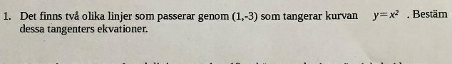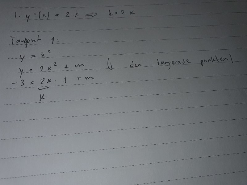 Du har börjat med en av de rätta pusselbitarna, men här kommer mitt viktigaste tips: Döp om tangeringspunkten. Kalla den vad som helst, men inte bara (x, y), för då kommer du att blanda ihop punkten med variablerna x och y som används för linjernas ekvation och för kurvan. Du kan kalla den (a, b) eller (xt, yt) eller något annat du gillar.