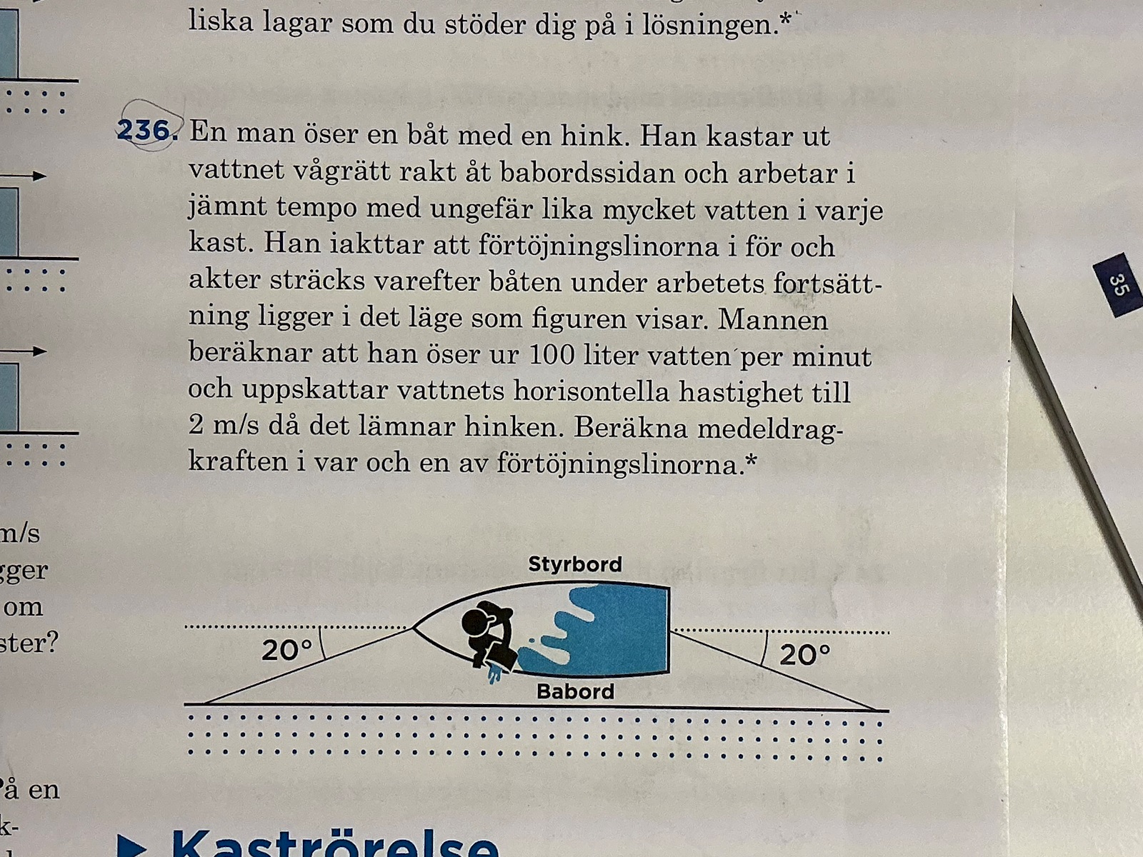 Vattnets ursprungshastighet är 2 m/s antar jag? Efteråt bör den vara 0 då den befinner sig i vila i vattnet, kan det stämma? Hur kan detta sedan kopplas till kraften i linorna?