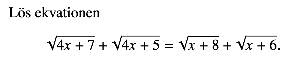 Kanske inte extremt klurig, men den påminner lite om rotekvationerna från äldre Studentexamen (som ofta var rel. kluriga). Denna är tagen från "Nätet". Exakt ursprung är dock oklart.