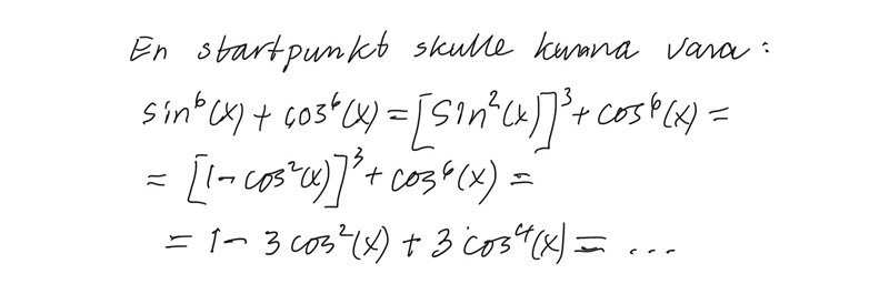 trig ettan eliminerar första parantesen. Sedan gömmer det sig en dubblavinkel för cosinus efter lite faktorisering: