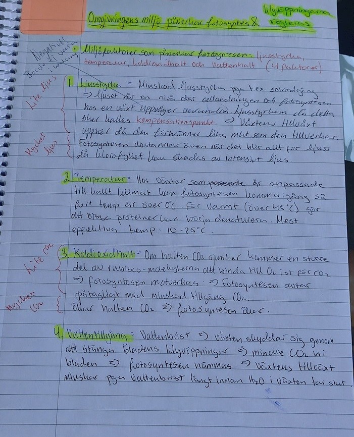 Oh ok! Jag har försökt skriva 2 separata resonemang kring de 2 frågorna, för att se hur samma 4 faktorer påverkar dem på sitt sätt (trots att många likheter finns). Detta blev anteckningarna om fotosyntes.