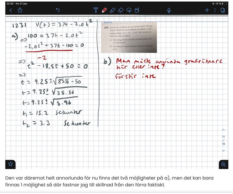 Kommentar: Motorcykelns fart ges ungefär av en andragradsekvation som växer till toppfarten som nås efter 9,25 s. Men sedan går kurvan ned igen och är helt fel för att beskriva motorcykelns fart som fortsätter så länge  Marie håller gasen i botten.