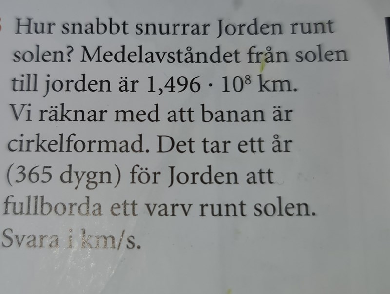 Börja med att beräkna längden på sträckan som jorden tilryggalägger under varv runt solen. Se till att enheten är kilometer.
