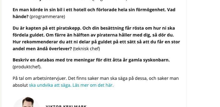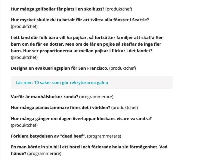 I övrigt så är det nonsensfrågor som någon hittat och tyckt var ett representativt problem att ta upp på en arbetsintervju. Det är ju Sverige 2019, så förvånad att man fokuserar på saker helt utanför arbetsbeskrivningen är jag inte. Relevanta saker inför jobbet är ju inte nödvändigt, bättre med google-information.