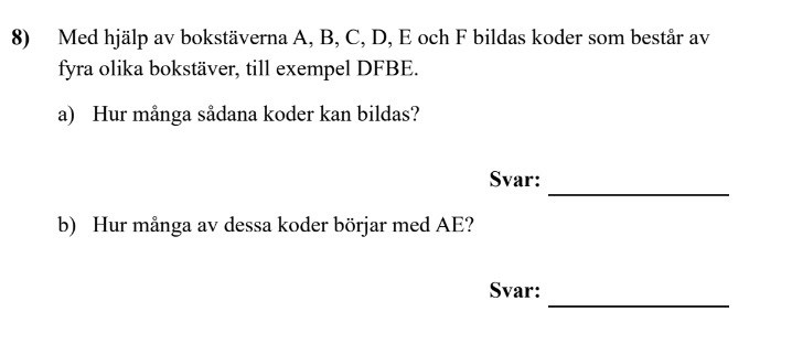 a)-uppgiften förstår jag då blir det 6!/(6-4)!= 360
