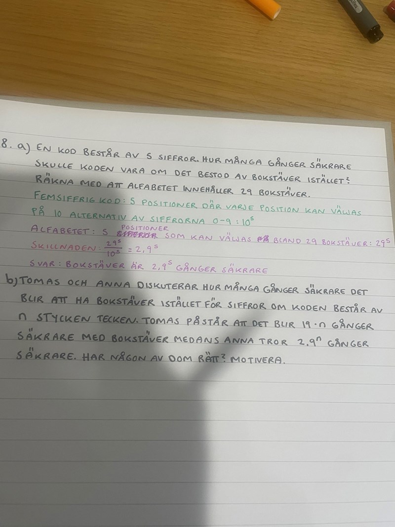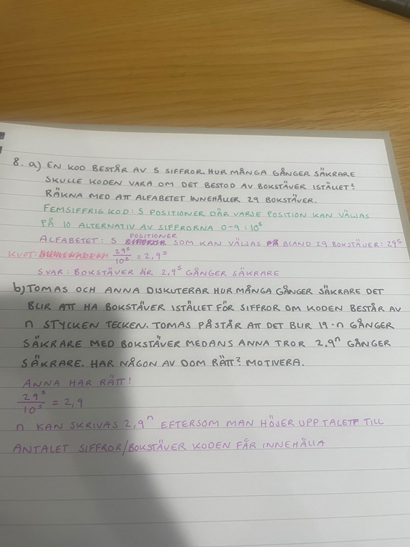 En kod består av 5 siffror. Hur många gånger säkrare skulle koden vara om den bestod av bokstäver istället? Räkna med att alfabetet innehåller 29 bokstäver: