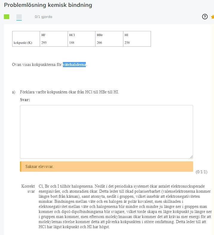 Vänta... så van der Waals-bindningar finns i vätebindningar och dipoldipol bindningar?! Eller missförstod jag. Men alla vätehaiderna har både lite dipol-dipol bindningar och van der vaals bidnningar eftersom deras elektronegativitet ligger lite mitt emellan "gränsern". När elektronegativiteten blir mindre blir det sämre dipol-dipol bindningar och mer van der vaals bindningar. Van der vaals bindningar påverkas av storleken på moleyklerna så den främsta anledningen till att kokpunkten ökar är för att molekylmassan tack vare en större molekylarea ökar vilket gör att det krävs mer energi för att molekylerna ska komma i rörelse men också att bindningarna bli starkare tack vare att det finns fler e- och det är större sannolikhet att de avviker från sina platser?