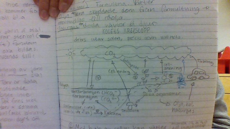 Jag tycker det ser bra ut faktiskt. Du har redan nu gått in ganska djupt på vad kolets kretslopp är med tanke på att du har med vilka joner och ämnen som finns med i kretsloppet. Du har dessutom en väl detaljerad bild!