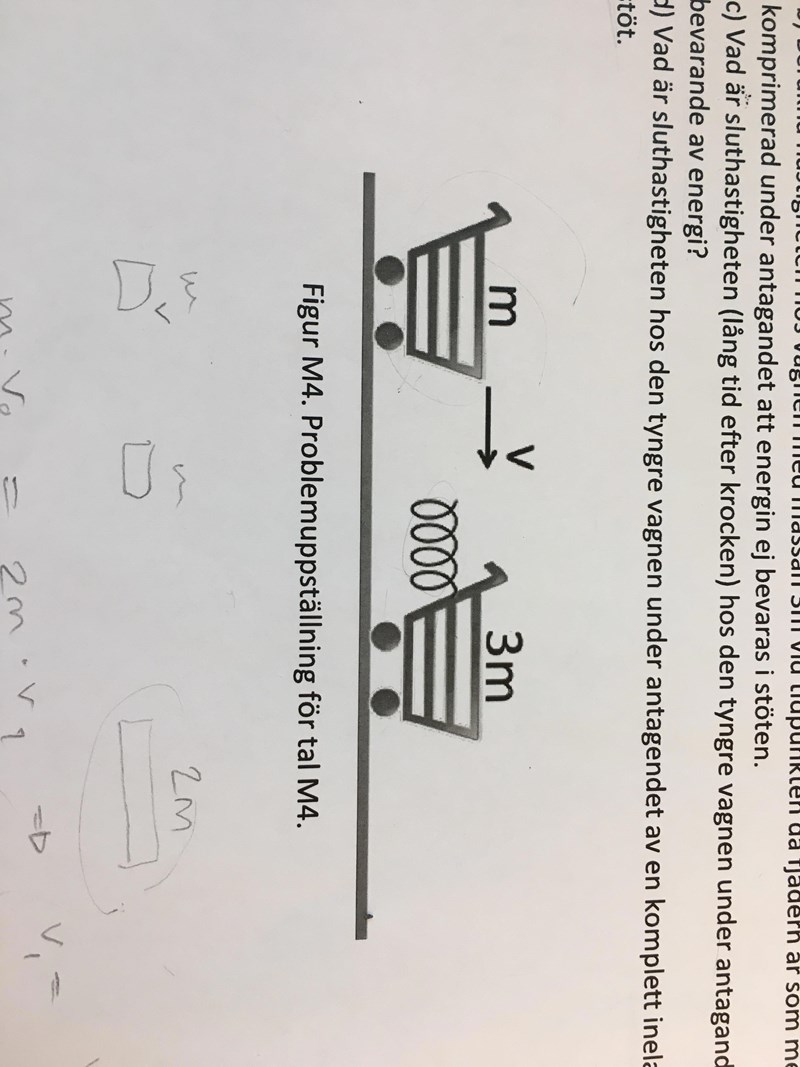 a). Beräkna hastigheten hos vagnen med massan 3m vid tidpunkten då fjädern är som mest komprimerad under antagandet att energin bevaras i stöten.