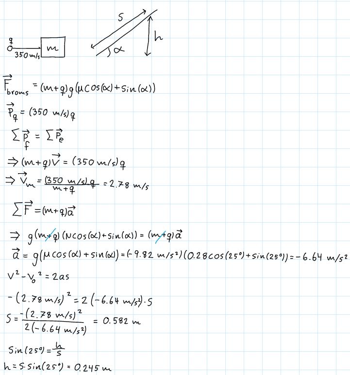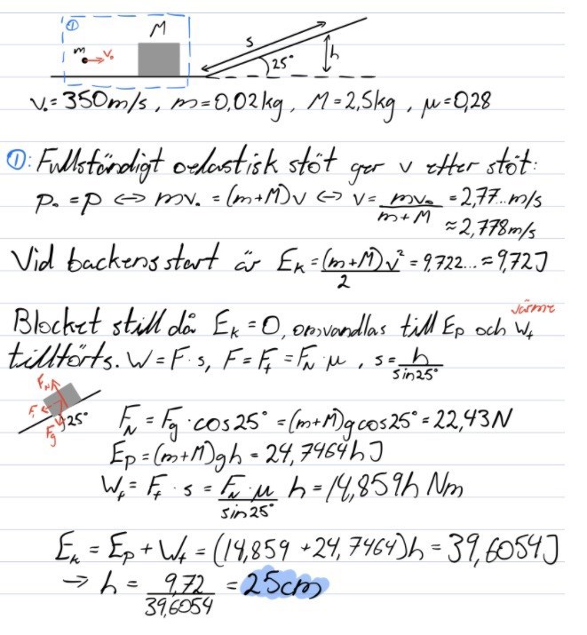 För frågan:” En kloss av trä väger 2,5 kg och ligger på ett horisontellt underlag utan friktion. En kula som väger 20 g skjuts med hastigheten 350 m/s in i klossen och fastnar, så att klossen börja glida. Rörelsen avstannar då klossen glider upp på ett lutande plan med lutningen 25°.Friktionstalet mellan det lutande planet och klossen är 0,28. Bestäm höjden h, den nivå klossen når innan den stannar.” hittade jag lösningen nedan, stämmer den eller finns det ett enklare sätt att lösa uppgiften på?