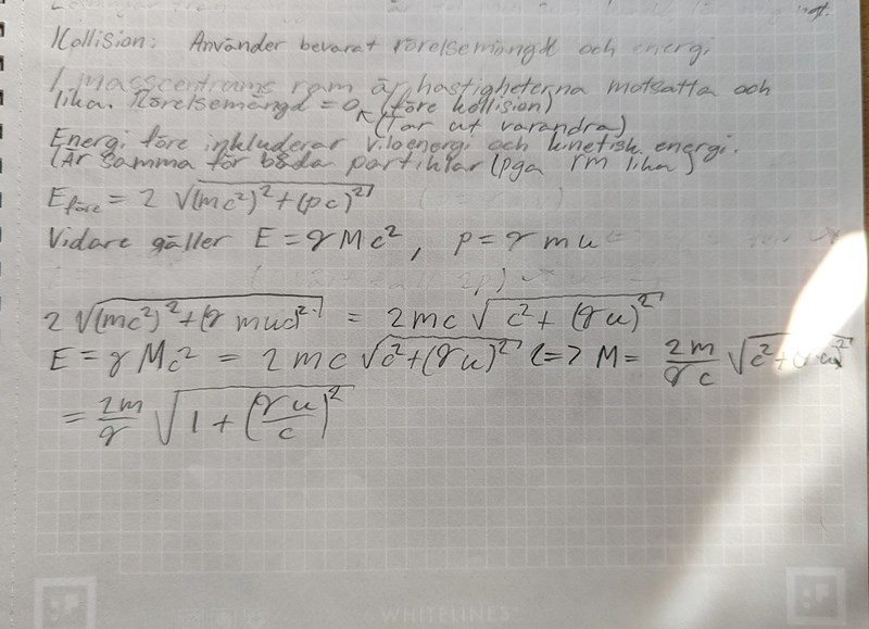 'Två kroppar, båda med vilomassan m, kolliderar rakt och fullständigt oelastiskt. Om de före kollisionen har relativ hastighet u, vad blir vilomassan för den sammanslagna kroppen? (tips: skriv ned bevarande av rörelsemängd, och eliminera den nya hastigheten m.h.a den hyperboliska 1an)'