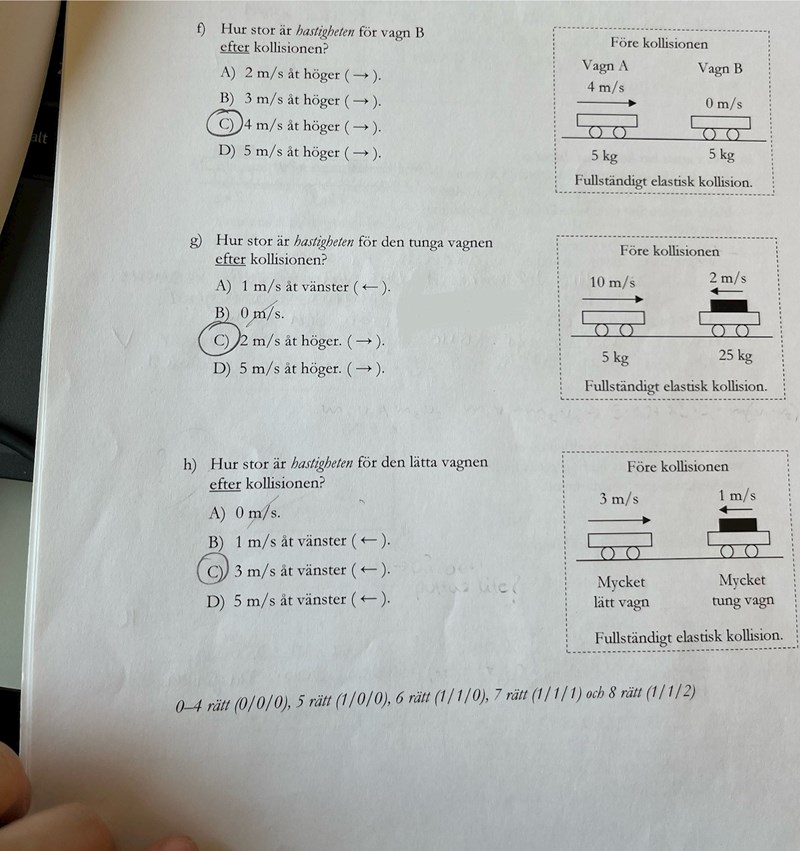 Exempelvis på den andra uppgiften har jag räknat ut att den totala rörelsemängden borde bli 0 (vet inte om det är rätt), men vad ska jag göra med den informationen och det känns inte heller som något alternativ borde vara rätt.