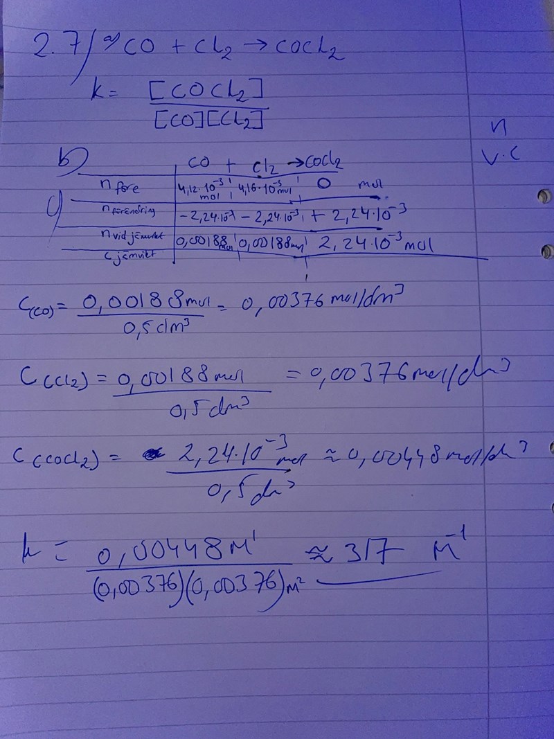 Jag skrev i min tabell att substansmängden CO innan jämvikt är 4,12*10-3 mol och substansmängden Cl2 är 4.16*10-3 mol. Jag förstår fortfarande inte vart felet är