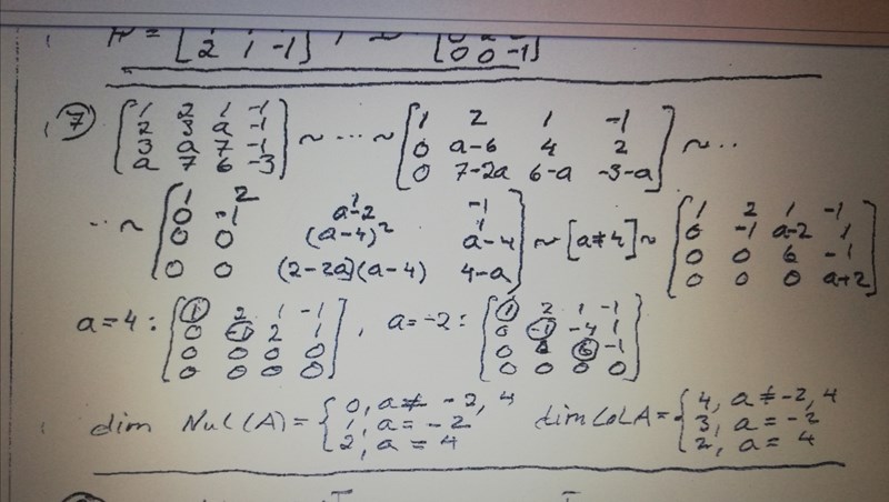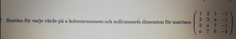 Jag undrar på värför är dimension av kolonrummet lika med 4 då a är inte lika med 2. Alltså som vi ser på matrisen i lösningan är innehåller pivåkolonnen nummer 3 pivåelementen( a-4) i kvadrat. Och pivåkolonnen nummer 4 innehåller pivåelementen(4-a). Så hur beror dessa värden på att a inte ska vara lik - 2 för att vi ska ha 4 pivåkolonnen.