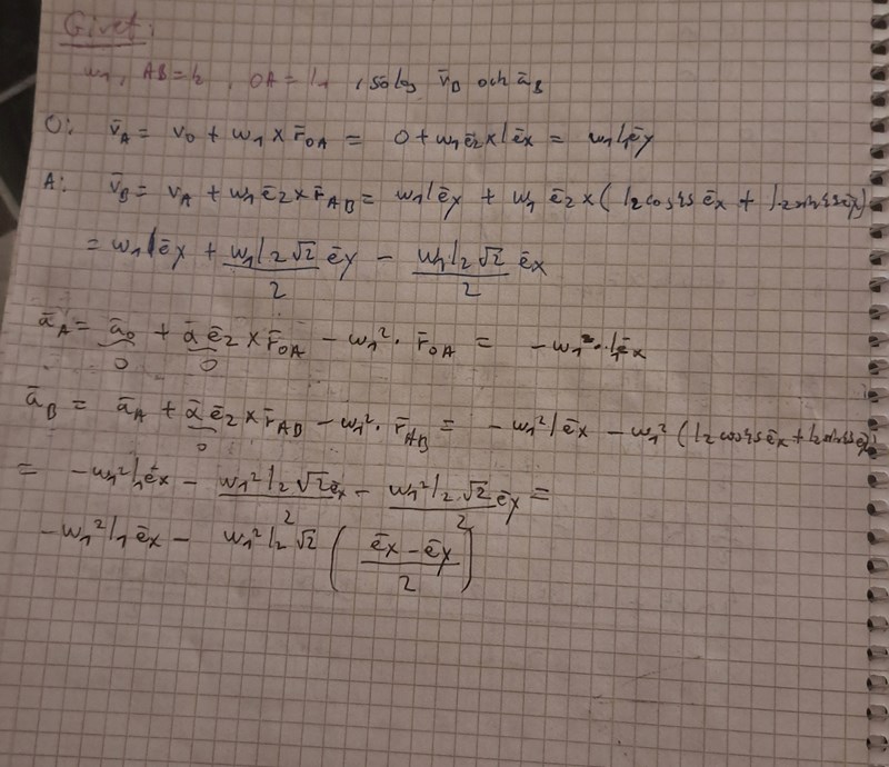 Jag gör det för att jag inte känner till vinkelhastighet i B eller A , men sen använde jag ju A som referenspunkt. Mitt svar på vb  är rätt då jag fick ett värde i ex, medan vb:s accelerationen så fick jag ex och ey komponent. Jag har dock inte tittat på facit så jag vet inte men såg en liknande uppgift i boken.