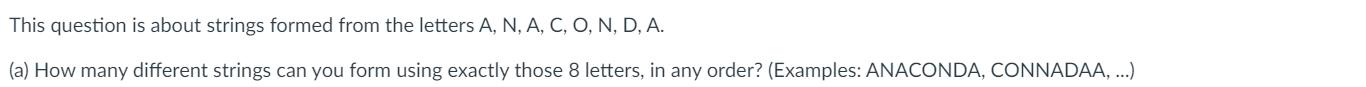 Sitter fast på den här uppgiften och är lite osäker på hur jag ska börja. Det som gör mig osäker är bokstäverna, behöver man ta hänsyn till hur många "A" och "N" det finns i strings? Isåfall hur gör man då? Jag tänker så här ifall man måste ta hänsyn till antalet bokstäver: