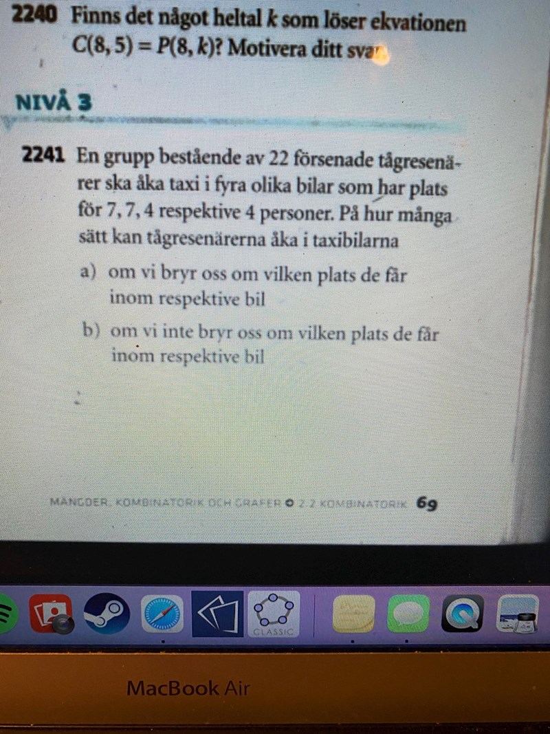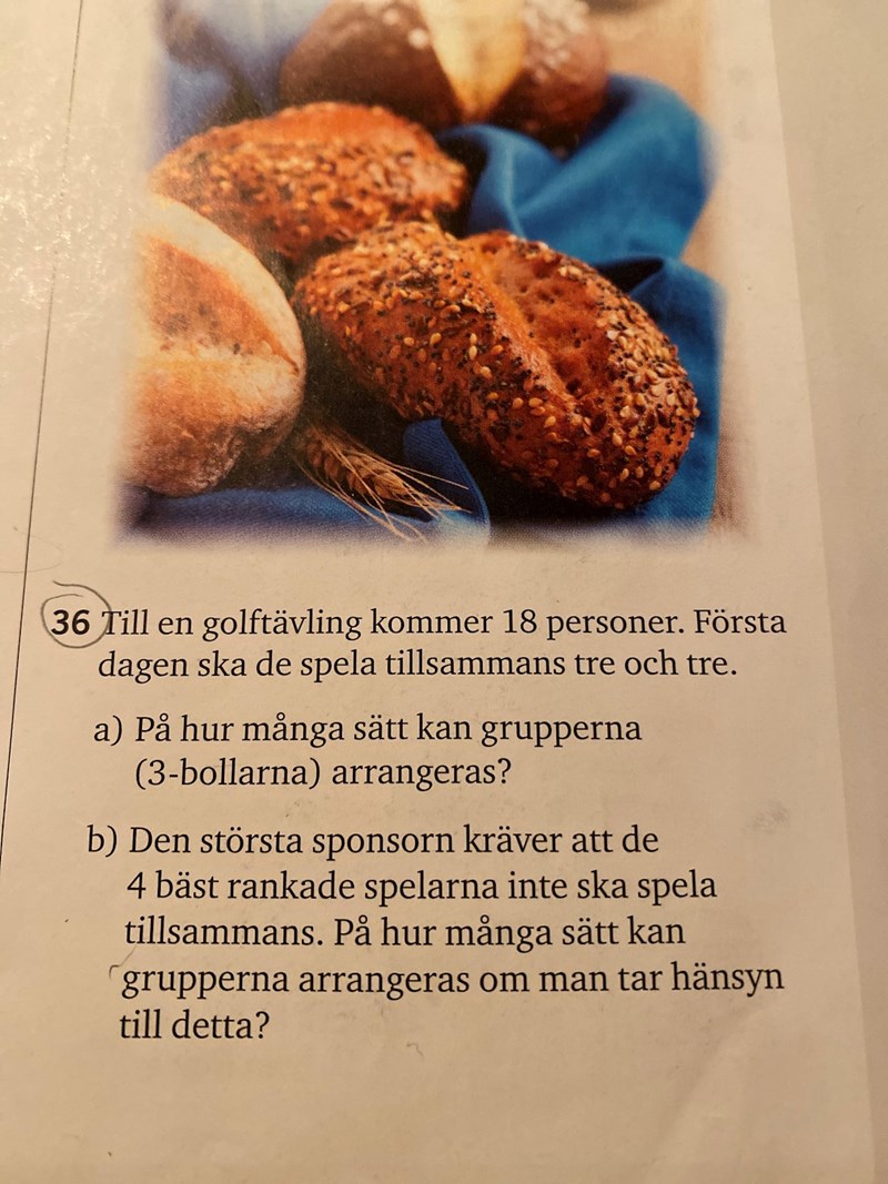 Hej jag har inte riktigt greppat det här med kombinationer och permutationer. Jag har två olika uppgifter 36b och 2241b som jag tycker liknar varandra. Ni kan se hur jag har tänkt på de båda uppgifterna nedan. Det jag är förvirrad över är vad man ska dividera uträkningarna med. I 36b delade jag det med 4! * 2! eftersom grupperna med de bäst rankade spelarna kan ordnas på 4! sätt och grupperna utan dem kan ordnas på 2! sätt. Jag tänkte att det borde vara samma sak på 2241b frågan och att ”taxigrupperna” kan ordnas på 2!*2! sätt men enligt facit skulle man inte dividera detta med 2!*2!. Jag skulle vara jättetacksam om någon kunde förklara vad som skiljer dessa fall åt hur hur man ska tänka med division vid sånna här uppgifter.